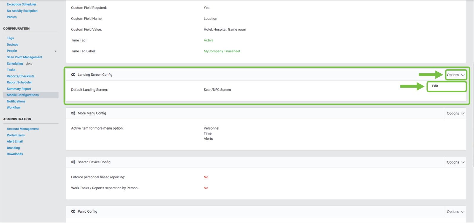 We will then navigate to the “Landing Screen Config” section, then click on the “Options” dropdown button. An option will be displayed, and we will click “Edit”.