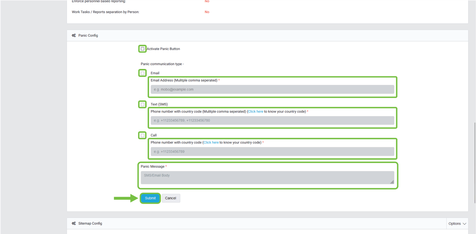 After clicking on the "Edit" button, we can click on the "Activate Panic Button" with the following settings: