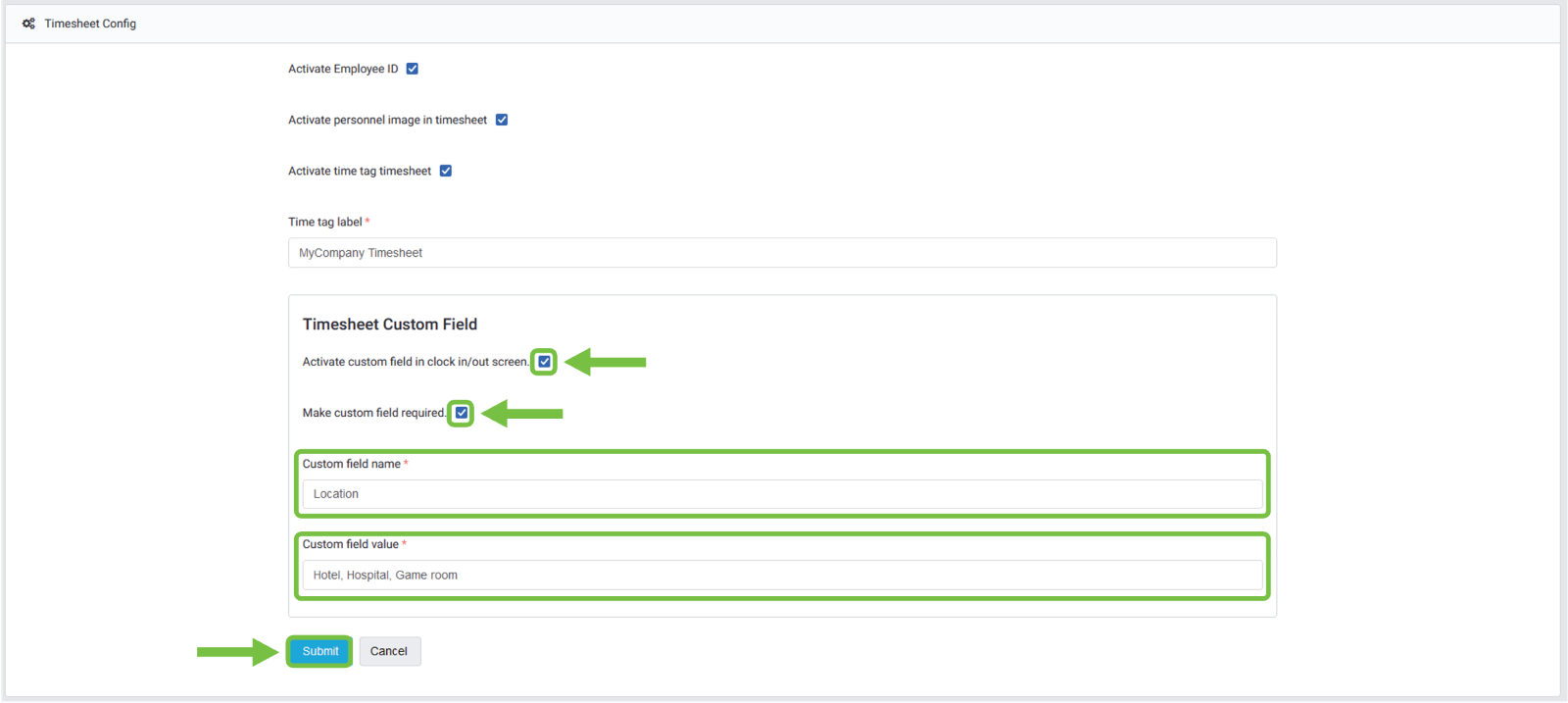 - "Activate custom field in clock in/out screen": We can “Enable” this option by clicking the checkbox or keep it disabled by leaving the checkbox blank.