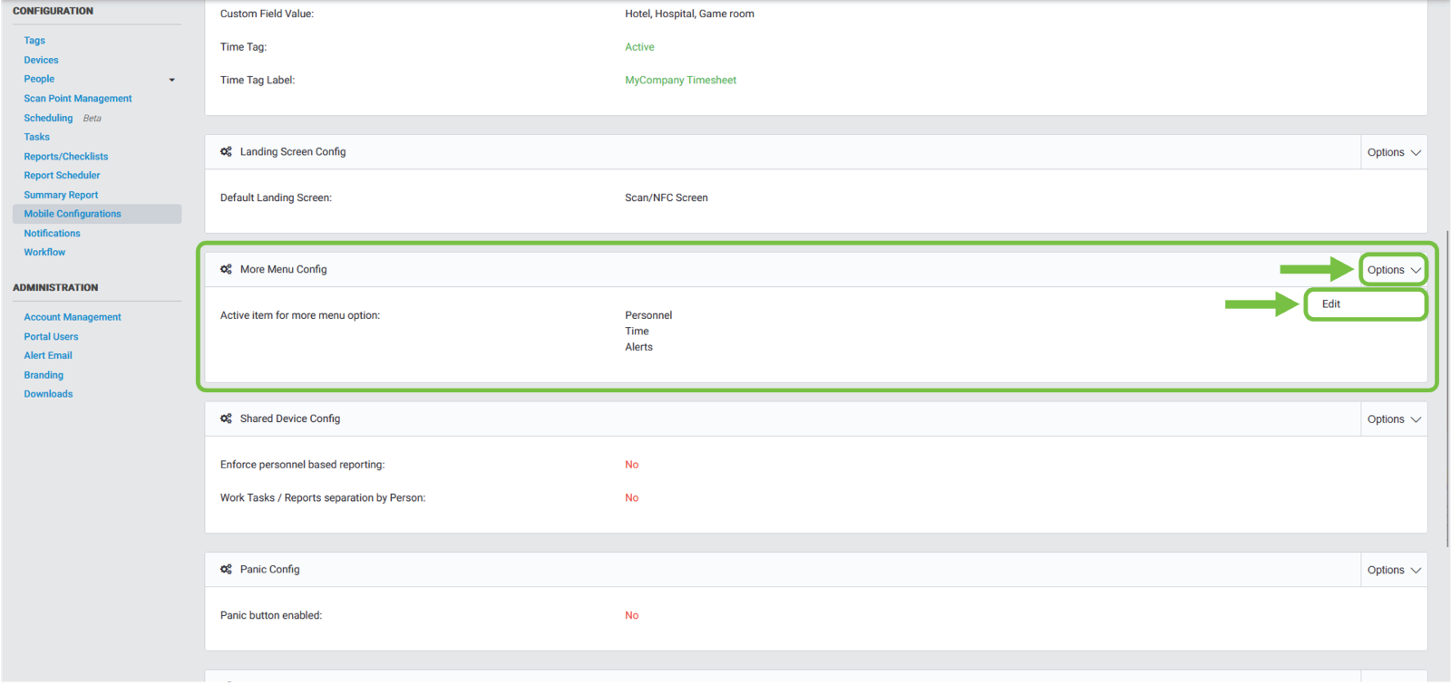 We will then navigate to the “More Menu Config” section, then click on the “Options” dropdown button. An option will be displayed and click “Edit”.