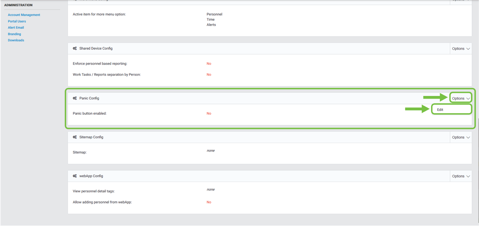 We will then navigate to the “Panic Config” section, then click on the “Options” dropdown button. An option will be displayed, and we will click “Edit”.