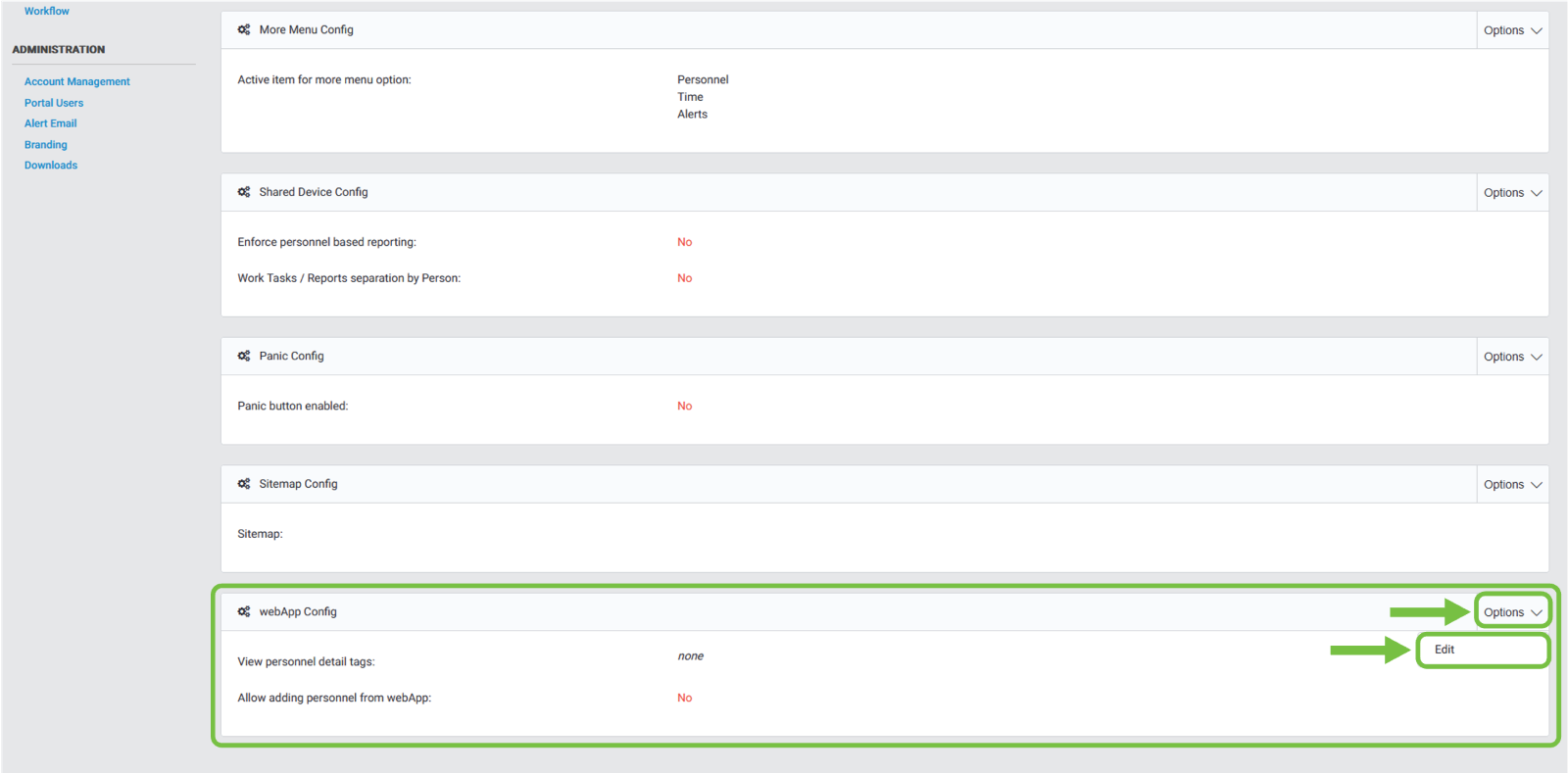 We will then navigate to the “WebApp Config” section, then click on the “Options” dropdown button. An option will be displayed, and we will click “Edit”.