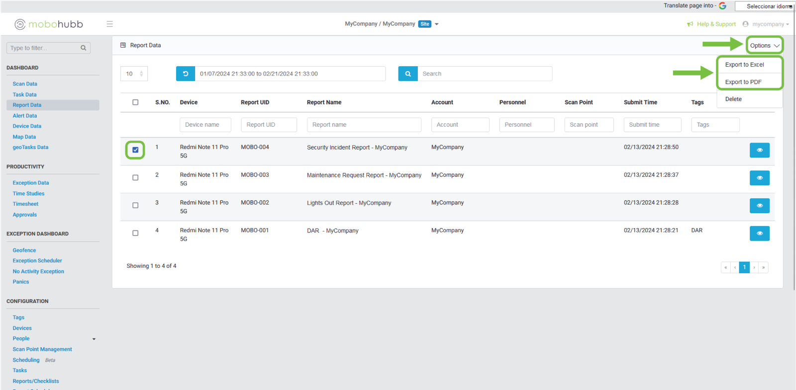Then we can mark the report that we want to export by clicking on the checkbox found in the first column of the row of the report that we want to export.