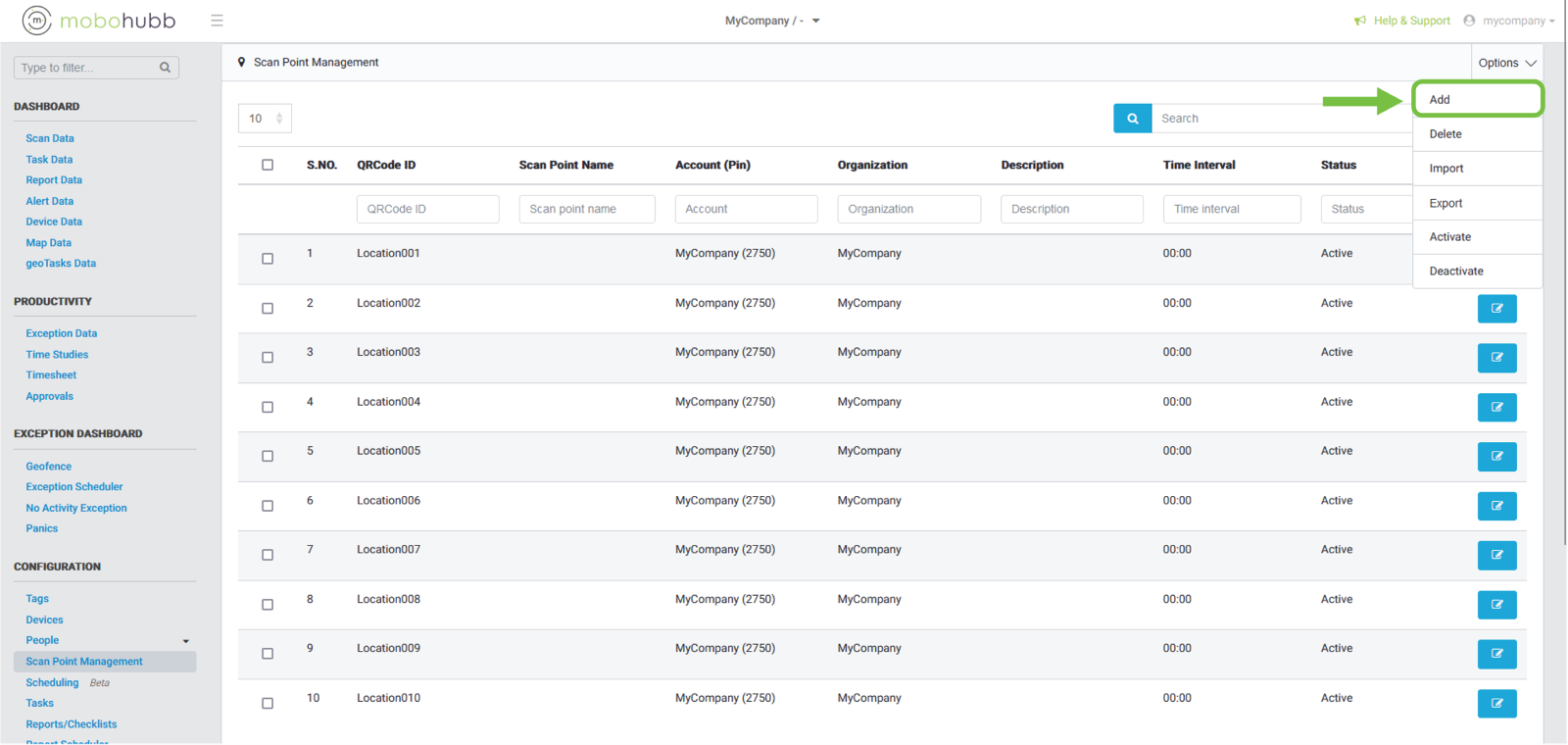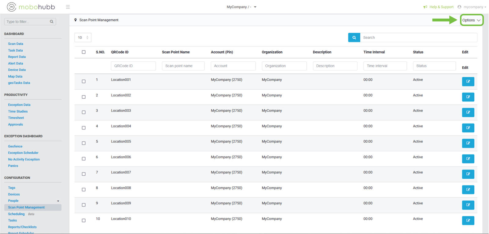 After clicking on “Scan Point Management”, the following view will be displayed, where you will have all the scan points created. Navigate to the upper right side and click on the “Options” button.