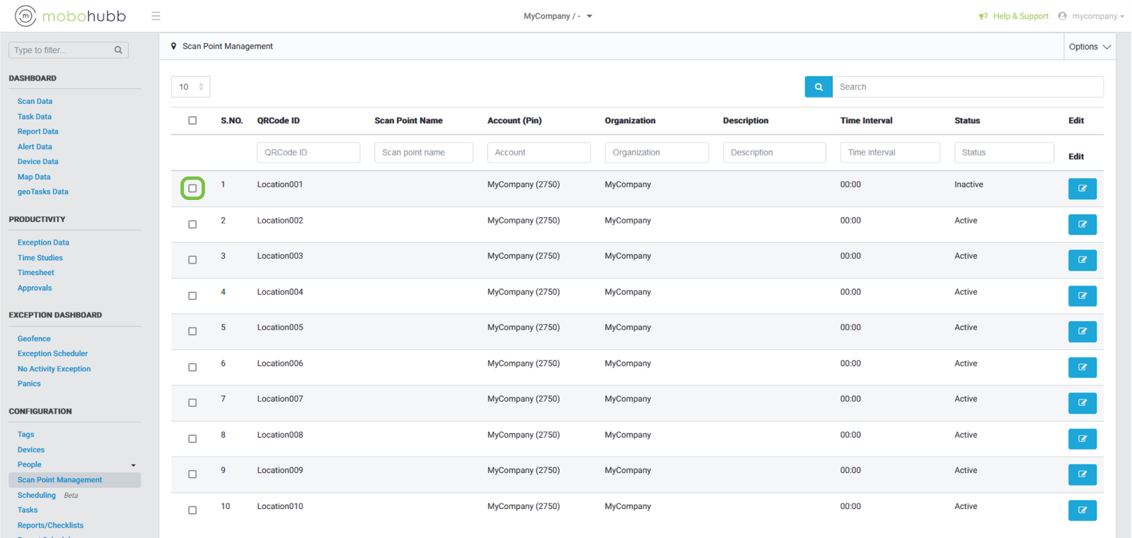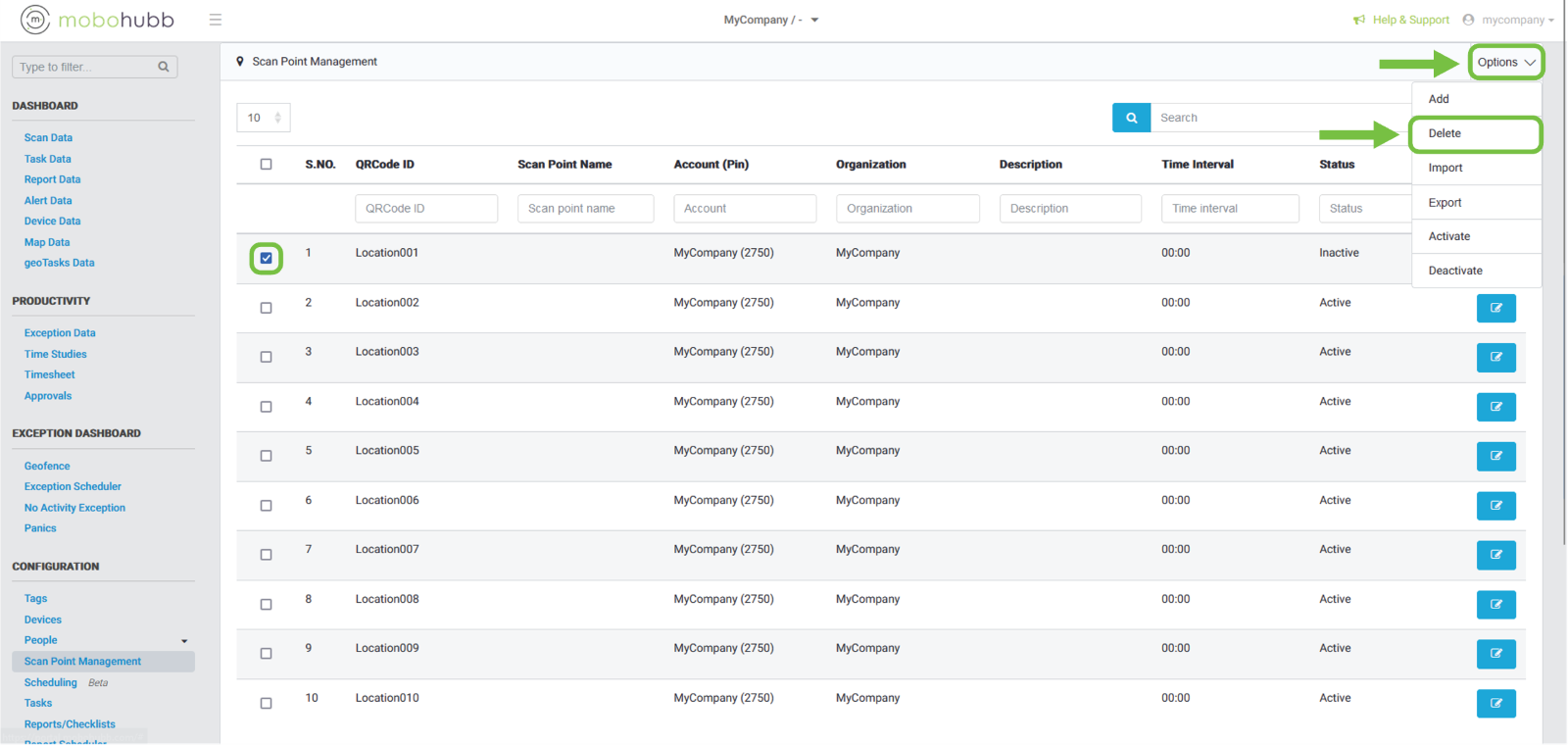 - Status: In this we can filter if the scan point is activated or inactive.