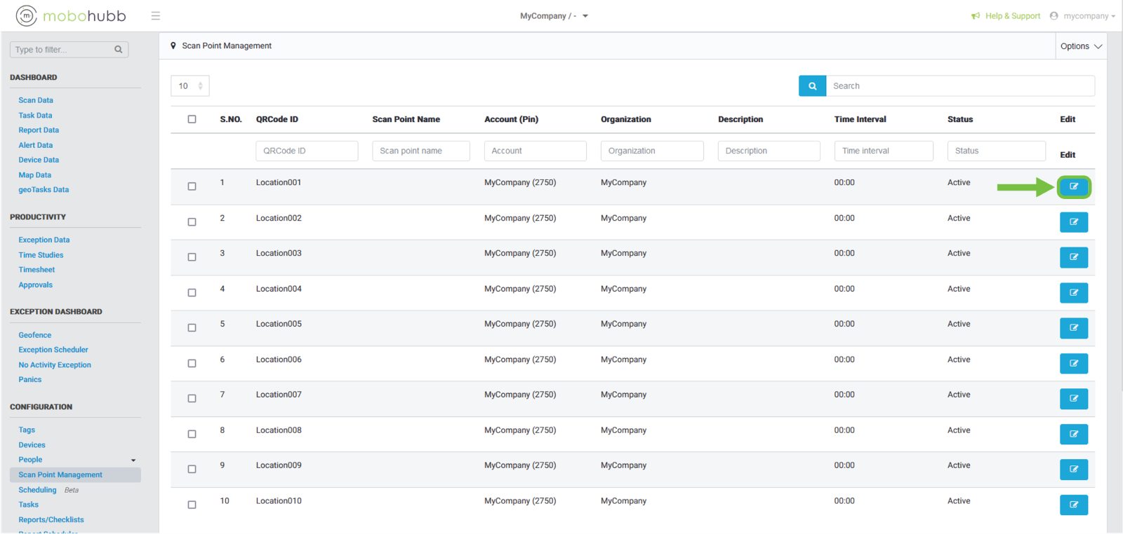 After clicking on "Scan Point Management”, the following view will be loaded, where all the scan points are shown. You must click on the "Edit Icon” in the last column, on the row of the scan point you want to edit.
