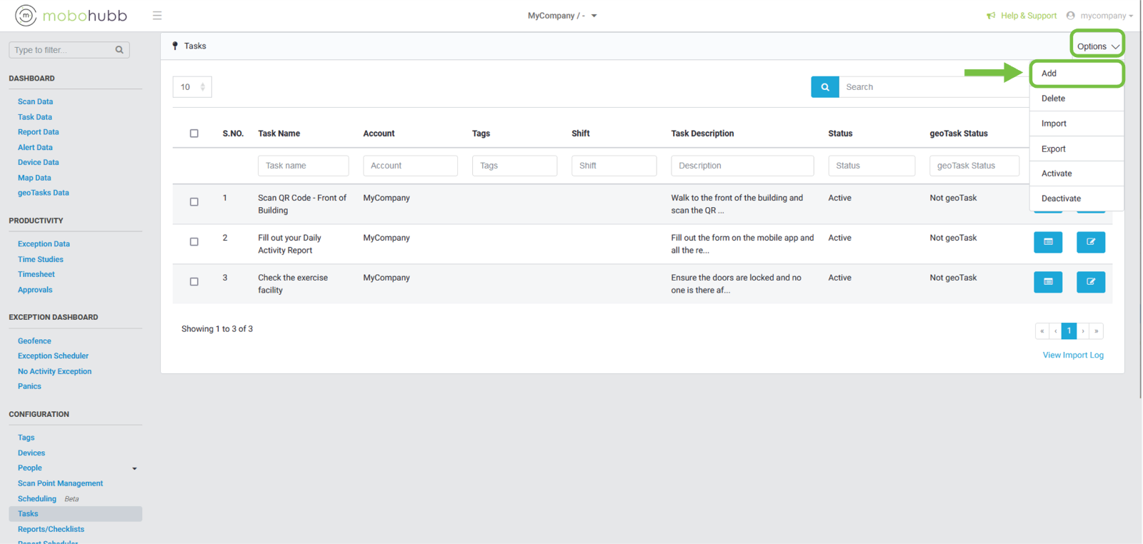 After clicking on “Task,” the following view will be displayed, where you will have all the tasks created. Navigate to the upper right side and click on the “Options” button.