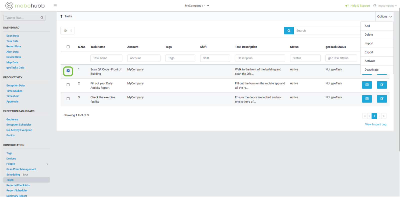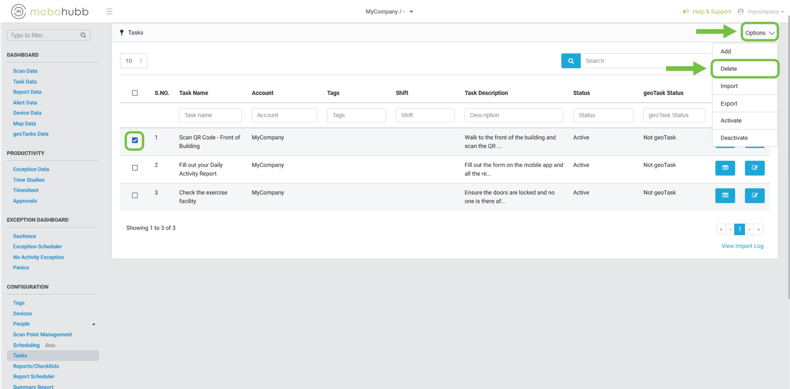 After selecting the task that we are going to delete, we will navigate to the “Options” button. Clicking on it will display a list of options, and we will choose “Delete”.