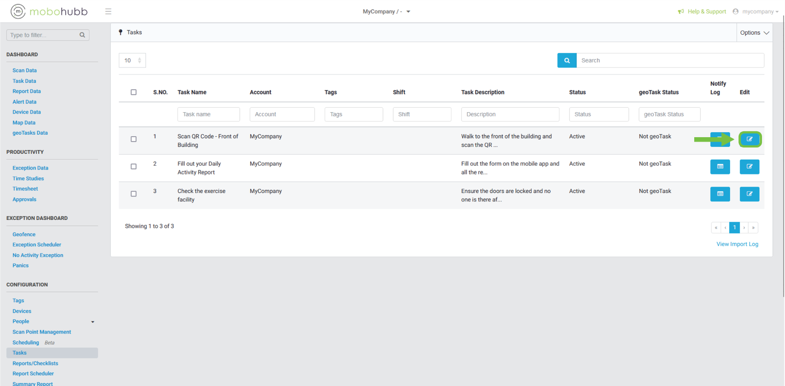 After identifying the task that we want to modify, we will navigate to the blue icon in the same row of the task and click on it.