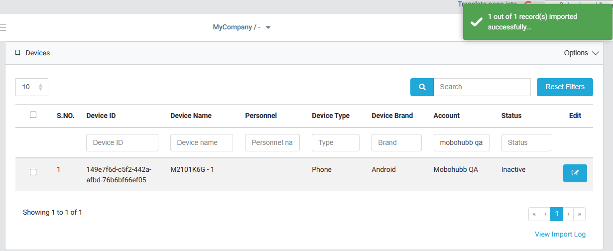 A message should pop up in the top right corner of the screen saying that the file was successfully imported, and the device(s) should be listed as inactive devices ready to be activated.