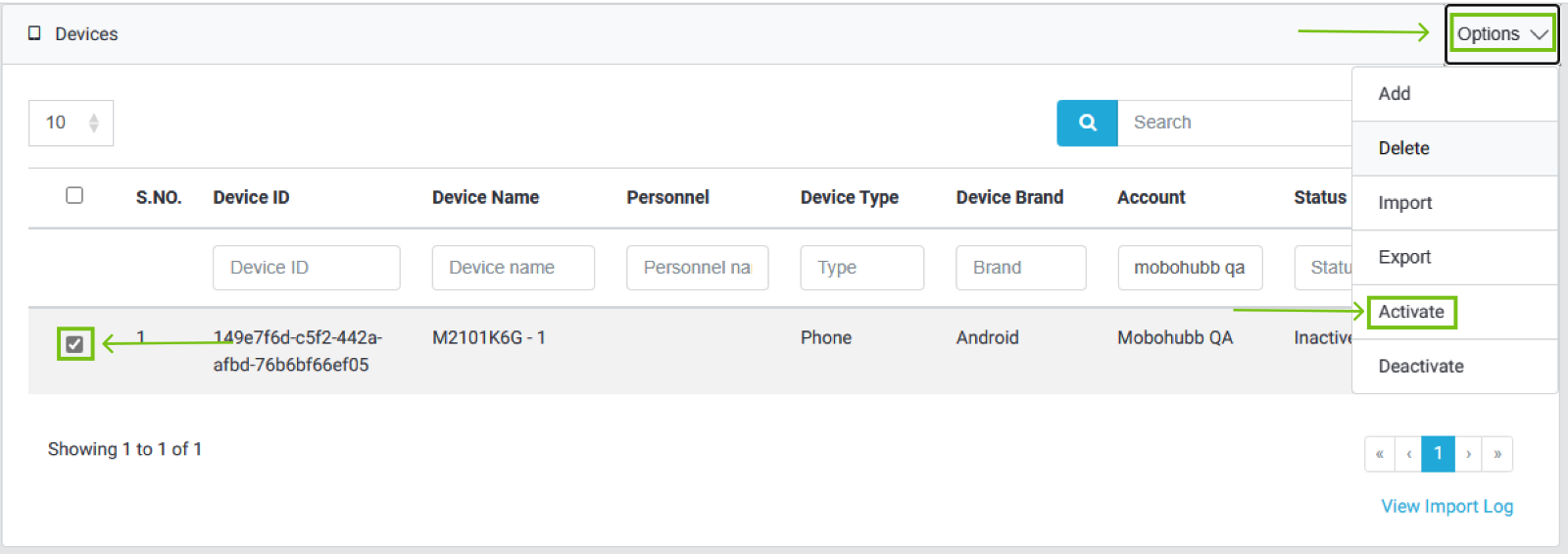 To activate a device(s), the checkbox before the device name in the first column should be marked, and then by going to the top right corner of the screen and pressing the “Options” button and selecting the “Activate” option, all the selected devices should be activated right away.