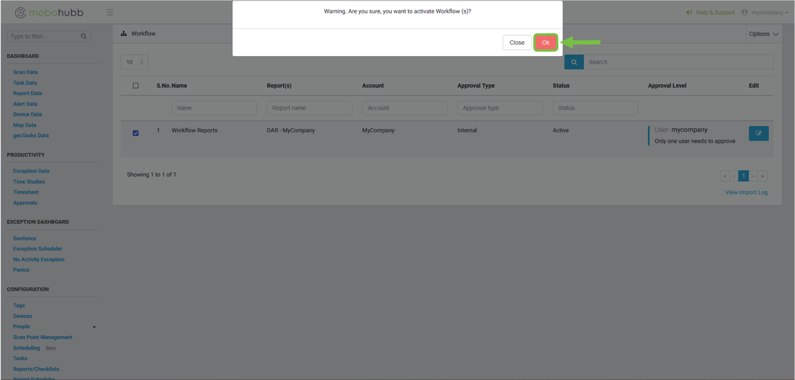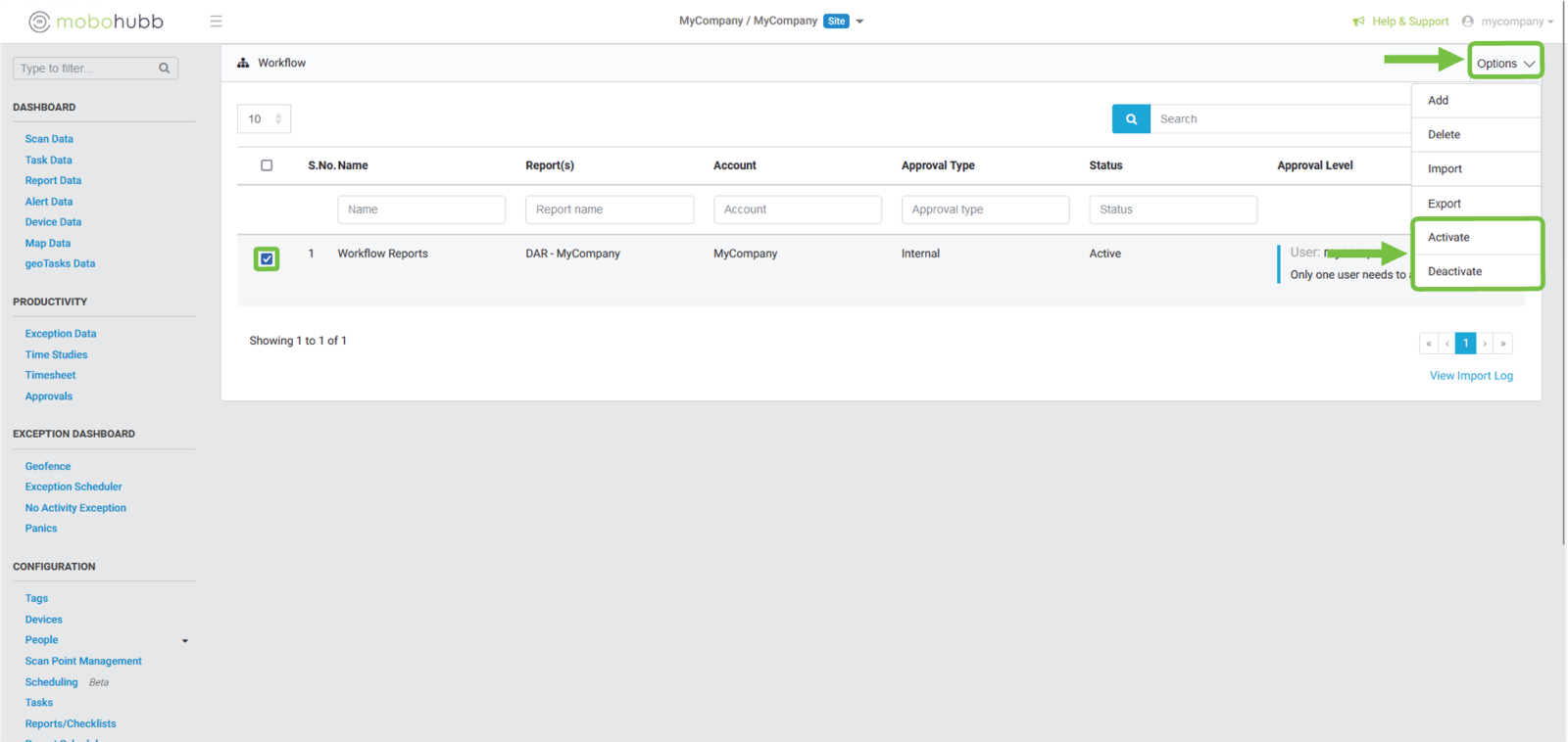 After identifying the workflow that we want to “Activate” or “Deactivate”, we click on the checkbox.