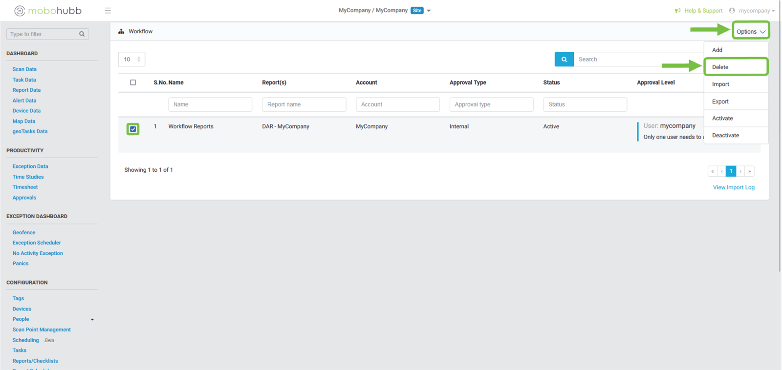 After identifying the workflow, we want to delete, we click on the checkbox.