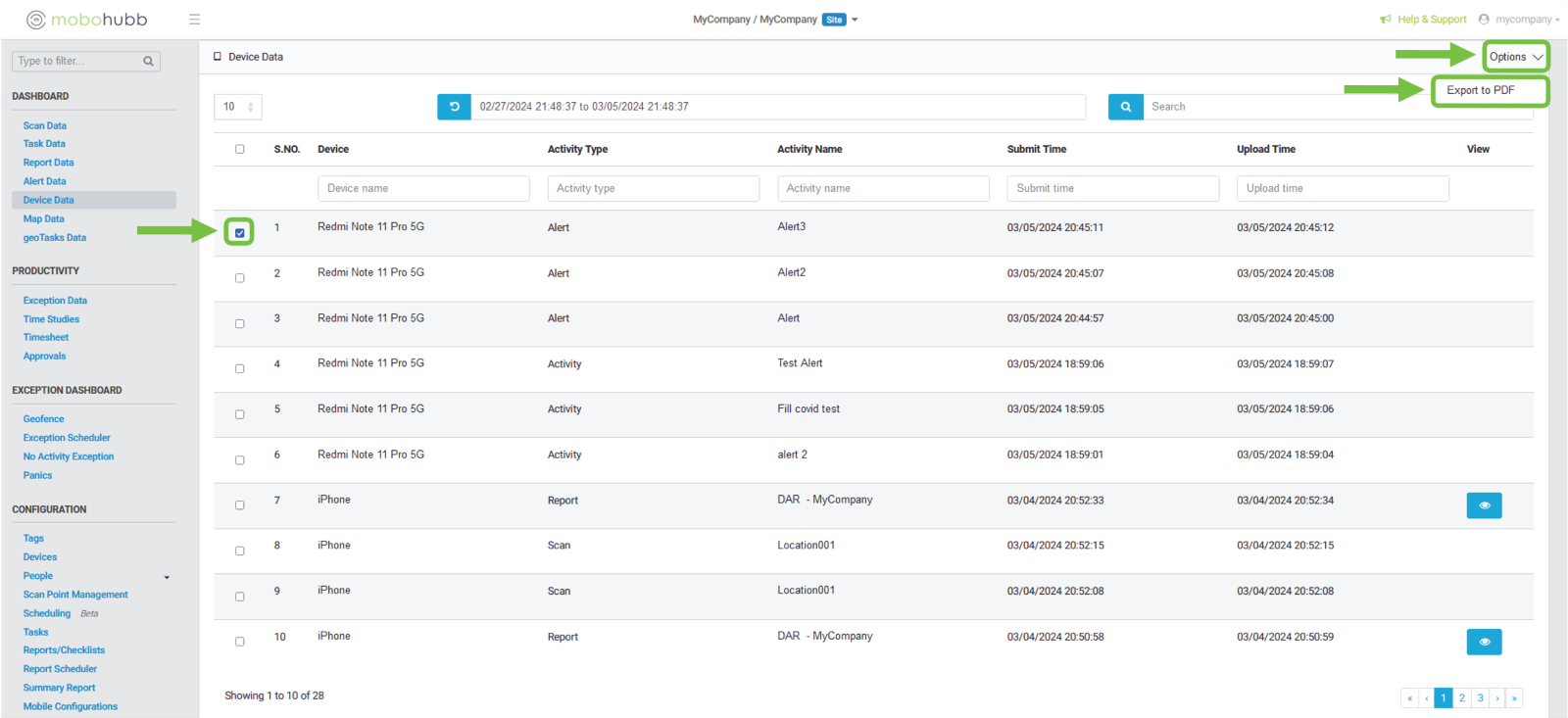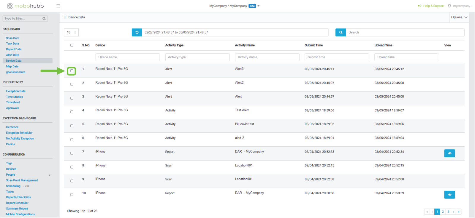 - Upload Time: to filter with the date and time of the device upload.