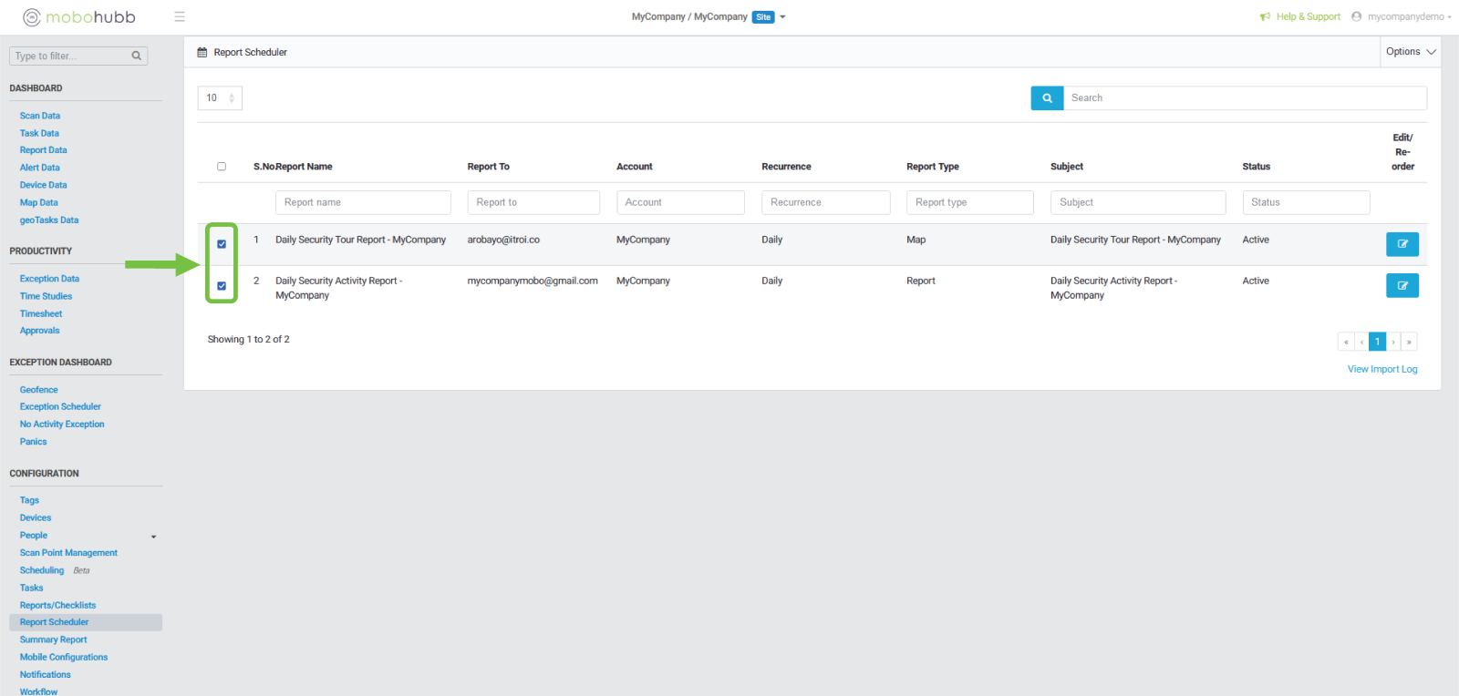 After clicking on the “Report Scheduler” button, the following view will be displayed, where we will see all the existing report schedulers. We can select one or more scan points to export by clicking on the checkbox.