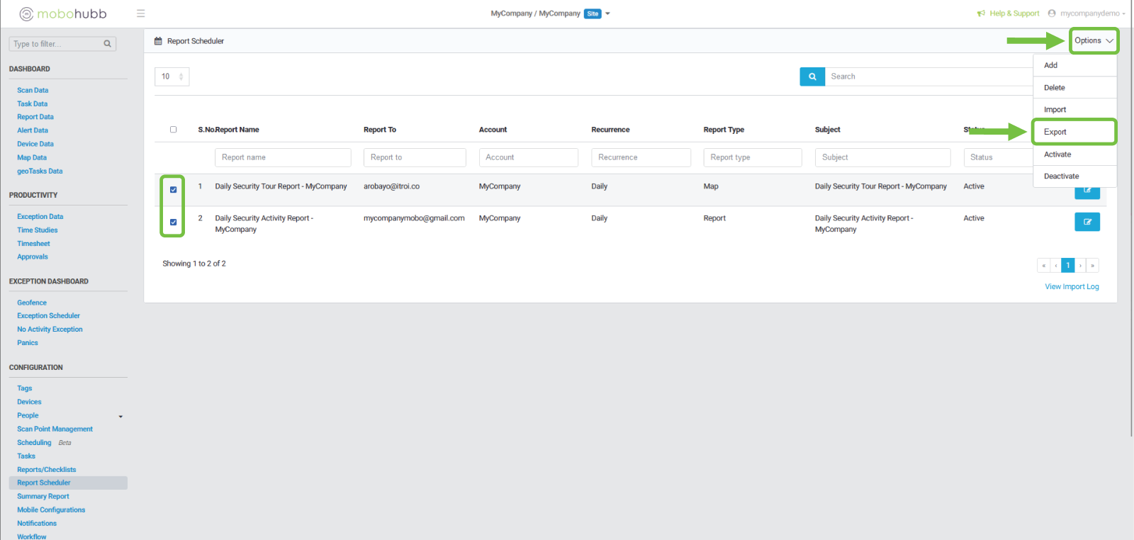 After you have selected the report scheduler you want to export (if you are exporting all, you do not need to select any report scheduler).