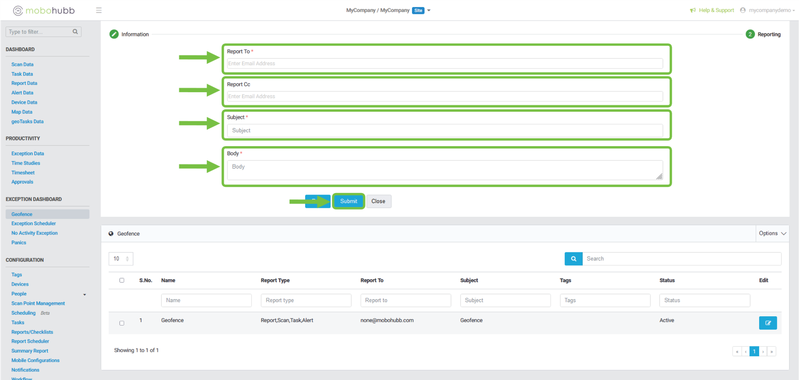 To update the geofence, navigate to the blue button at the bottom and click on "Submit.".