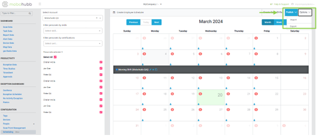 Similar to other options on the platform, you can import or export schedules by clicking on the options located in the upper right corner of the platform. This functionality allows you to manage schedules according to your specific requirements.