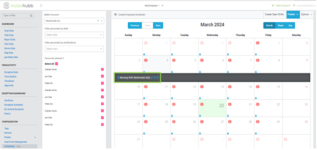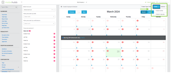 Additionally, on the right upper side of the platform, you'll find the "publish" option. Here, you can choose to publish either the full calendar or only the shifts. It's important to note that your personnel will receive notifications on their phones regarding new schedule assignments or changes to existing shifts.