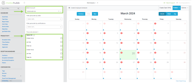 After selecting the scheduling option, you can begin configuring schedules for employees. Choose the relevant account and filter personnel based on skills or certifications or select specific employees. Upon selecting the organization, the list of employees associated with that account will be displayed below.