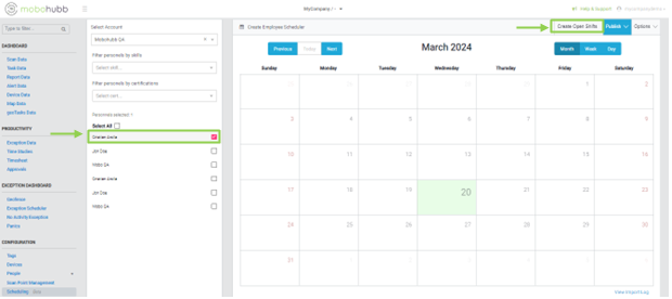 After selecting the personnel or employees for whom you wish to create a schedule, click on the 'create open shifts' located in the upper right part of the platform. Within this option, you can personalize the shifts for the personnel.