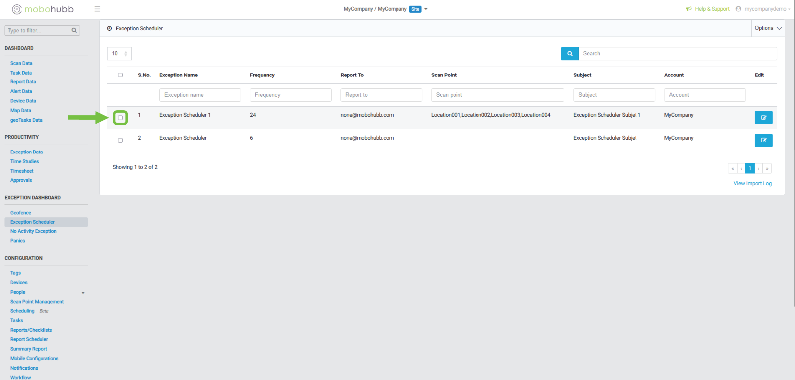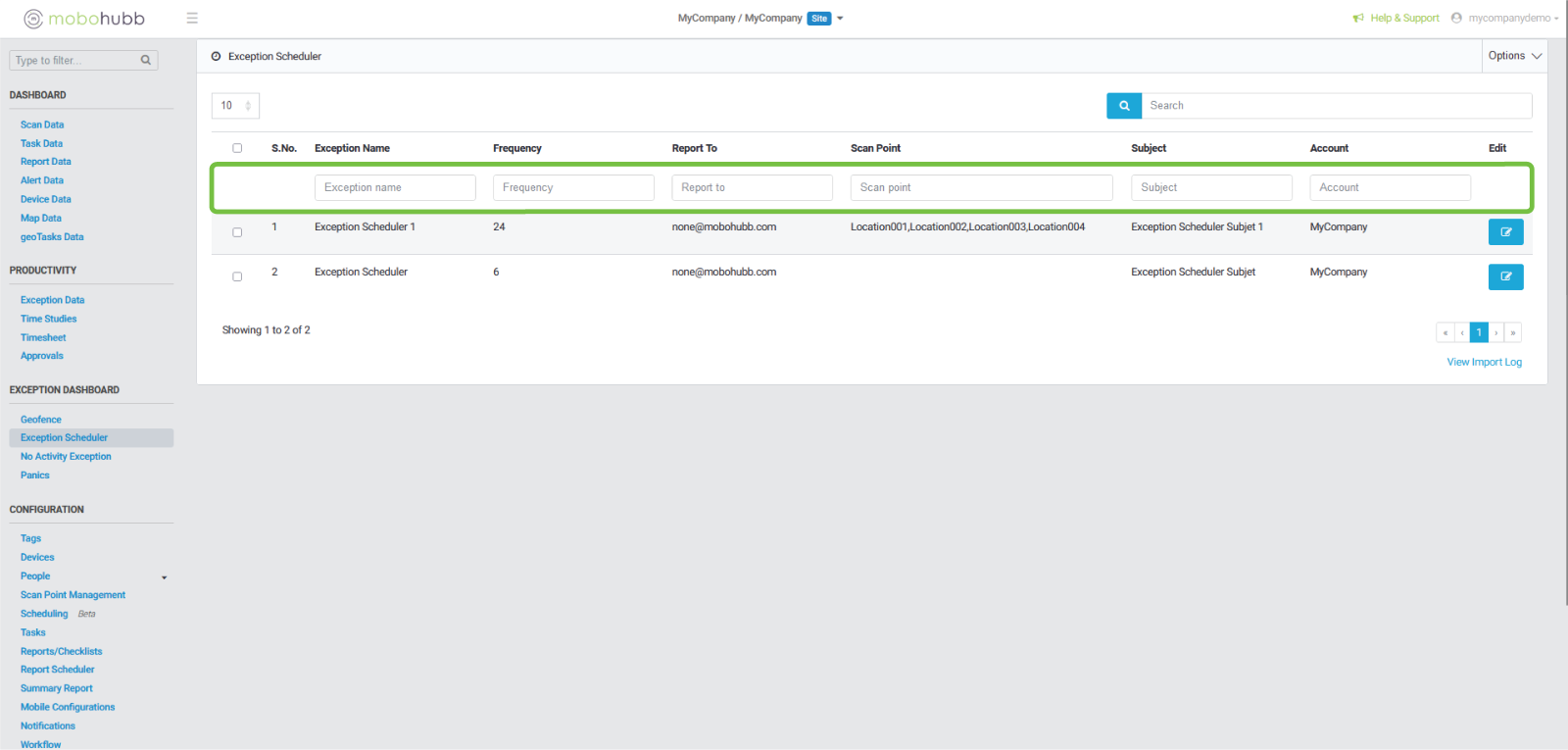 - Exception Name: To filter using the report name.