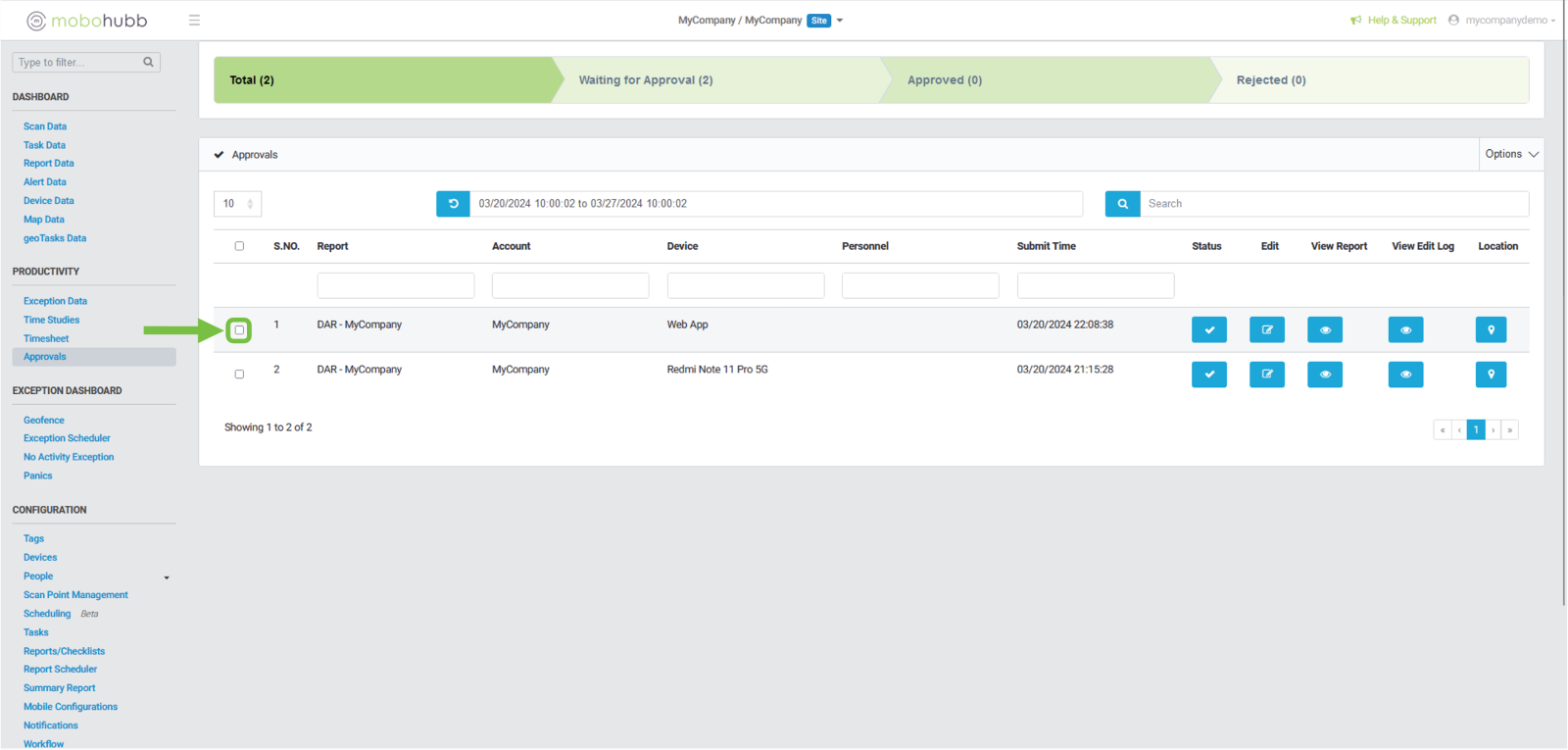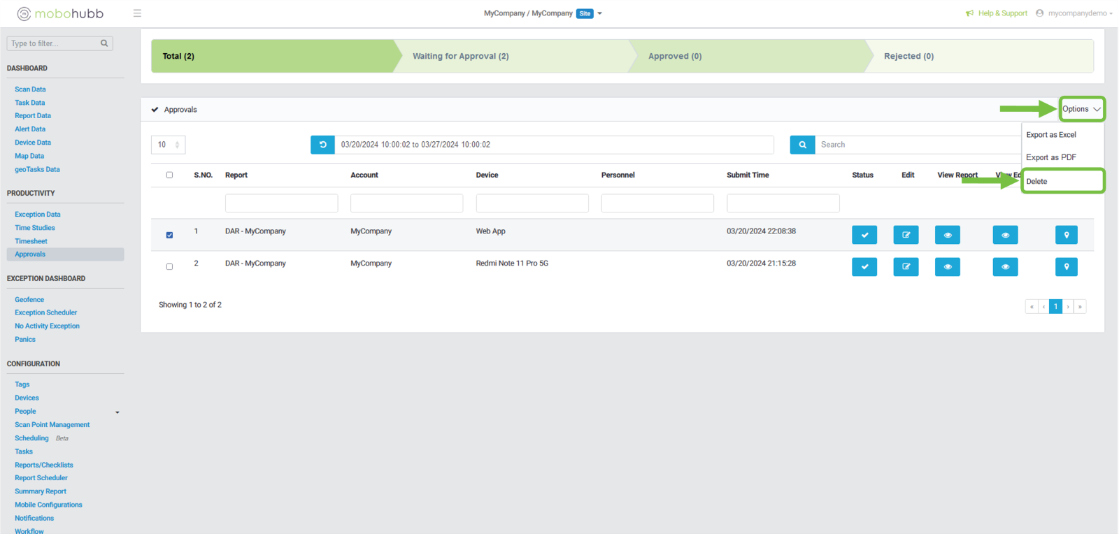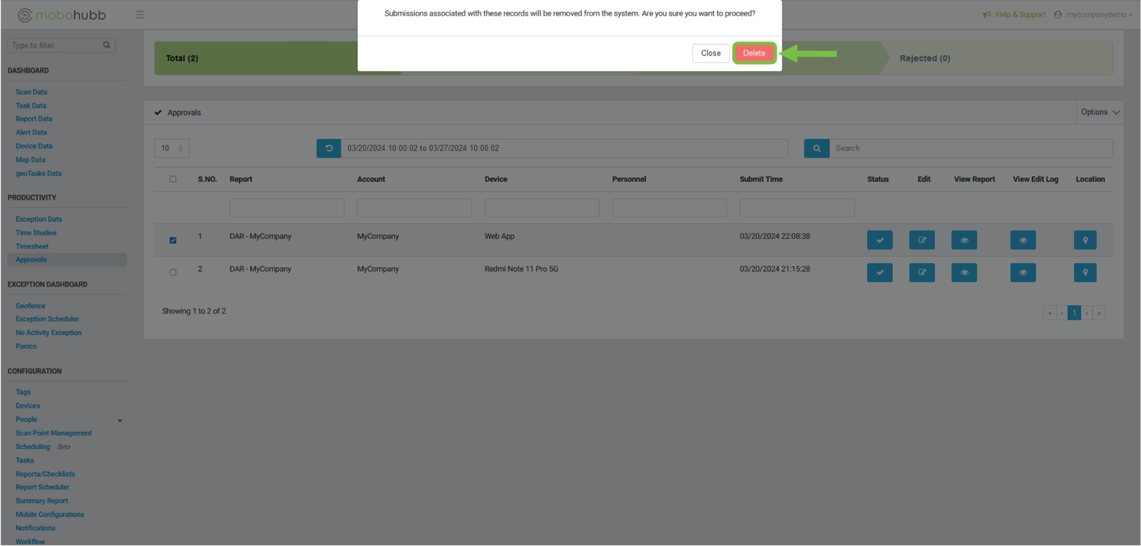 After identifying the approval, we want to delete, we click on the checkbox.