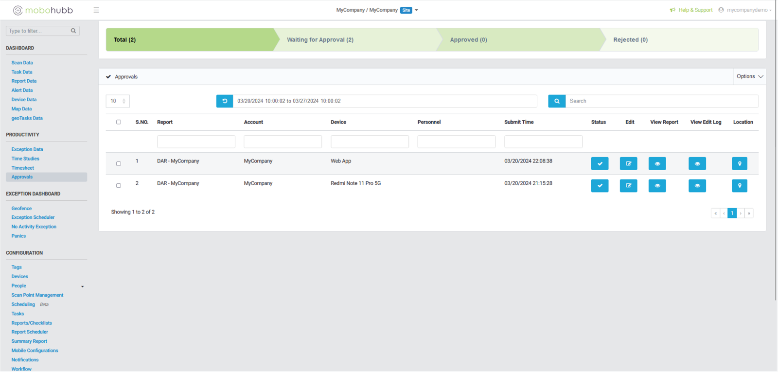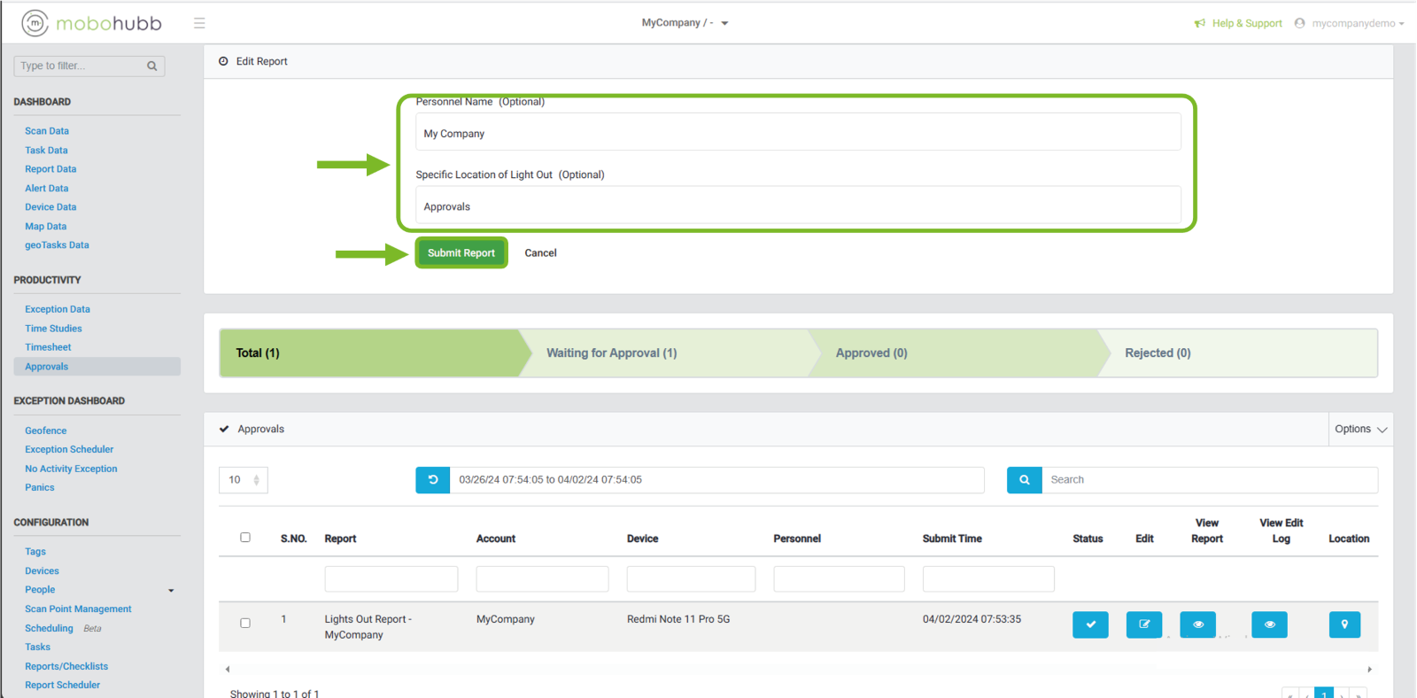 After clicking on the edit icon, a new section is loaded at the top of the screen, where you can edit the configured fields of the report/checklist. When you finish editing, you can click on "Submit Report" in this case. will be sent to the "Waiting Approvals" section.
