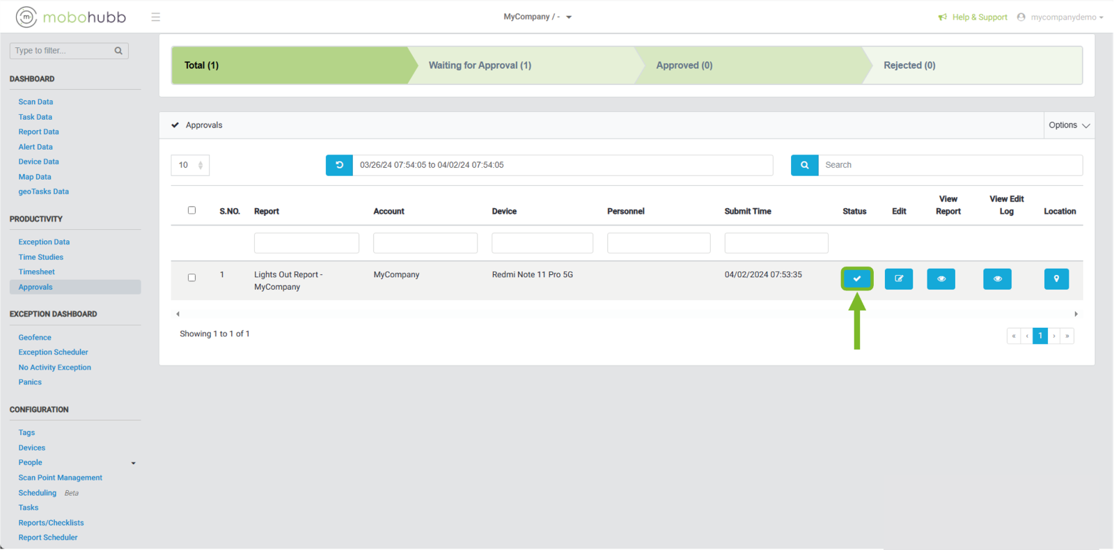 After identifying the approval that we want to submit, we click on the check icon.