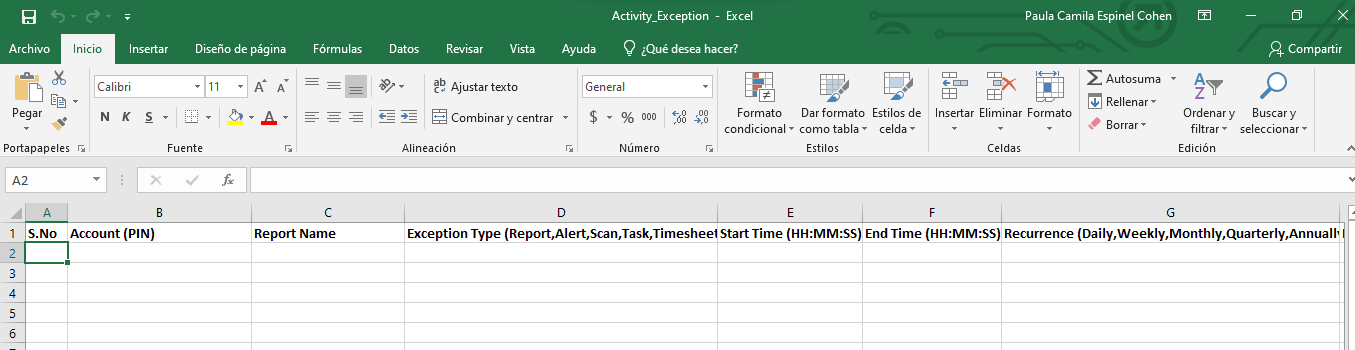 At the end of downloading the template, we will open the Excel file with the name "Activity_Exception", in which we will fill out all the information about it.