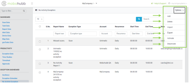 After having selected the not activity exception report that you want to export (if you are going to export all, you do not need to select any reports), we will navigate to the "Options" button on the upper right side. We will click on it, and then a list of options will be displayed. We must choose "Export", the download of an Excel format file will immediately begin.