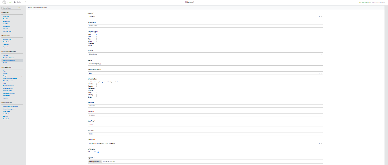 To add a new report without activity exceptions, click on the designated button. A screen will then appear, allowing you to fill in the required information regarding the report and configure the exception. Please provide the following details: