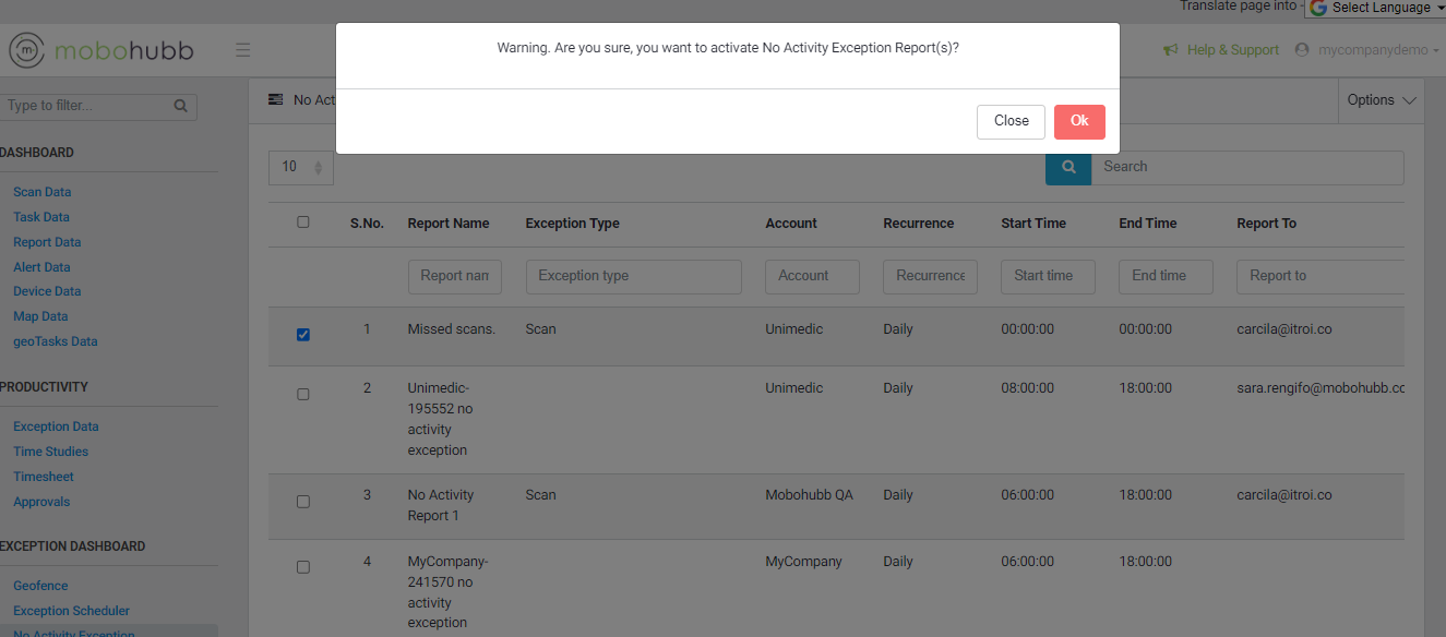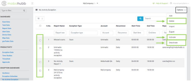 To delete, activate, or deactivate one or multiple reports with no activity exceptions, click on the checkbox located on the left side of the options corresponding to each report. Once you have selected one or more report, click on the desired action: delete, activate, or deactivate. This streamlined process allows for efficient management not activity exceptions according to your preferences.