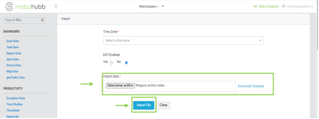 To import a new not exception activity report, make click on the "Import" button, a new section will appear in the view. You can select the time zone, if you want to enable or not the DST and import your data. When you click in “Import data” We will click on the blue link "Download Template", after clicking the file, the download will begin.