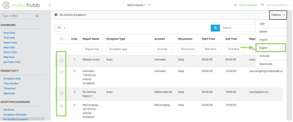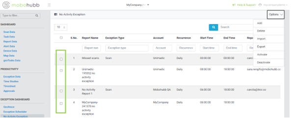 To export data, after clicking on the “Not activity exception” button, the following view will be displayed, where we will see all the existing tags. We can select one or more reports to export by clicking on the “checkbox”.
