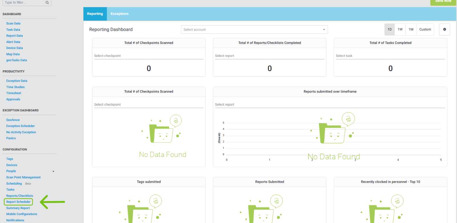 You can navigate to the panel on the left side of the platform and click on the option "Report Scheduler" located below the Exception Dashboard.
