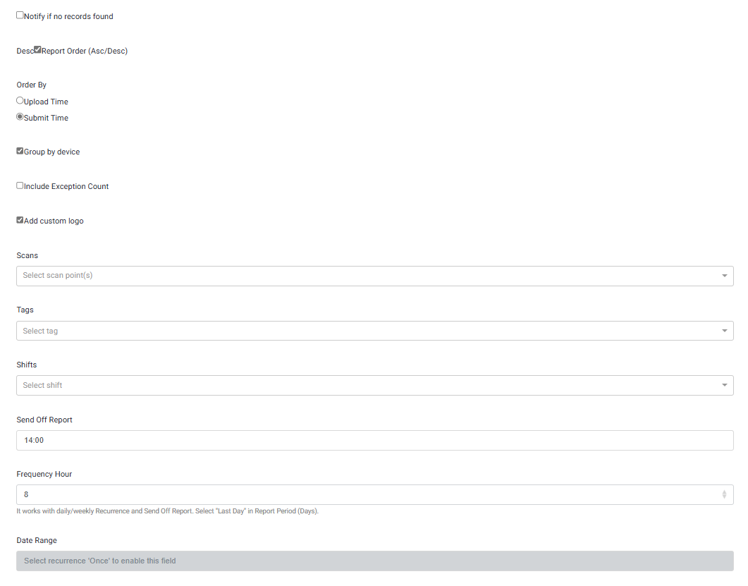 Please adjust the frequency hour and the Send Off Report time to match your guard’s shifts and receive a report for that time frame each day. If you have multiple shifts during the day, just make sure to create a new scheduled report for each shift.